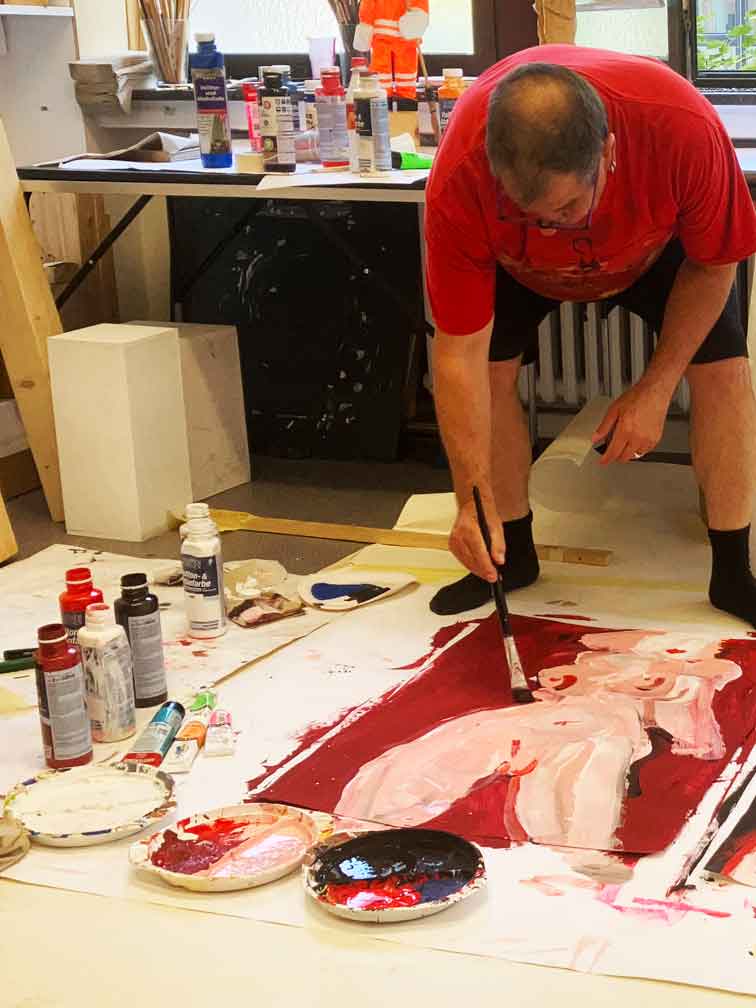 Das ist die Kunst – kurz hinschauen,sich einprägen und mit schnellem Stift das Gesehene festhalten. Auch hier bindet Herz gerne den Stift an ein längeres Lineal, damit er nicht die komplette Kontrolle über den Zeichenvorgang hat. So entstehen wie bei den großen Bildern immer wieder unerwartete Linien, die der Zeichnung Leben einhauchen.