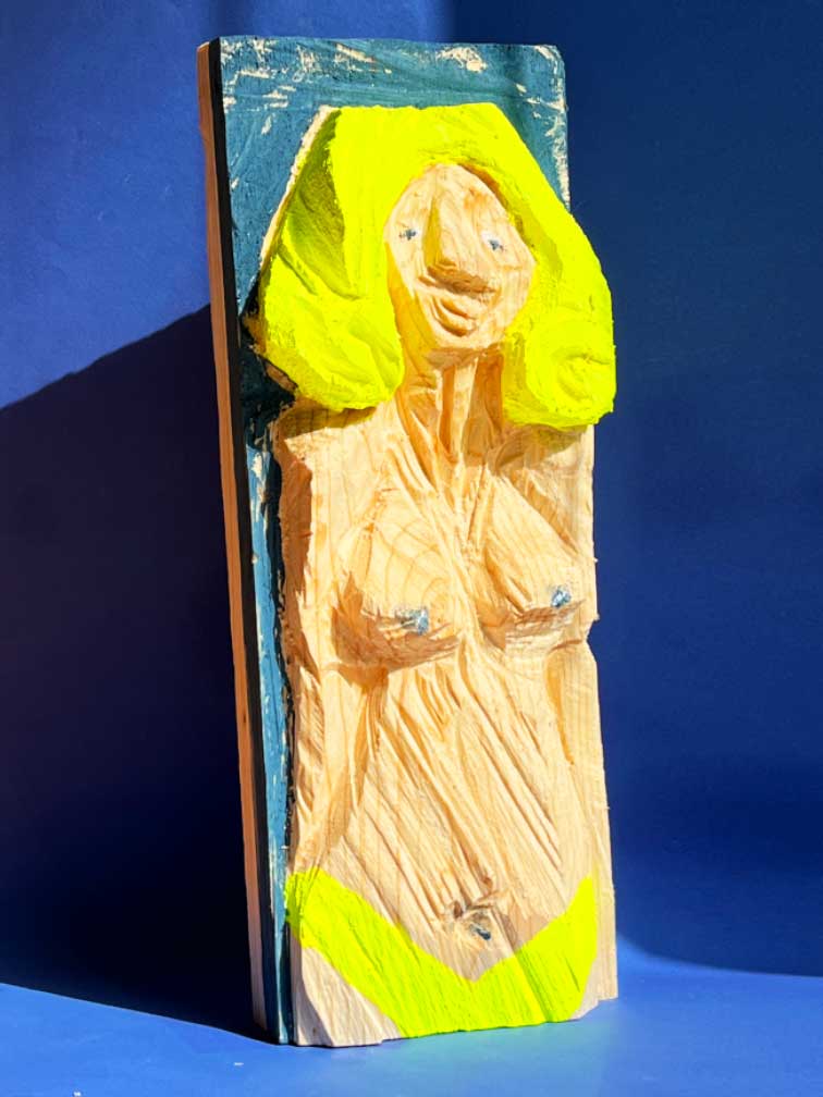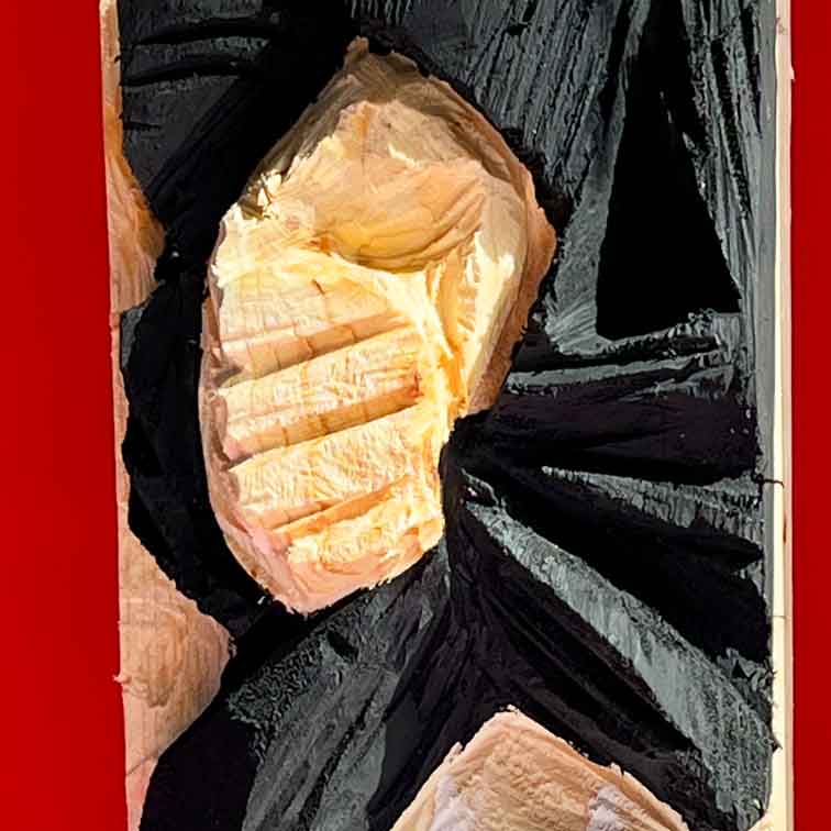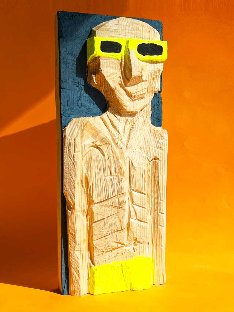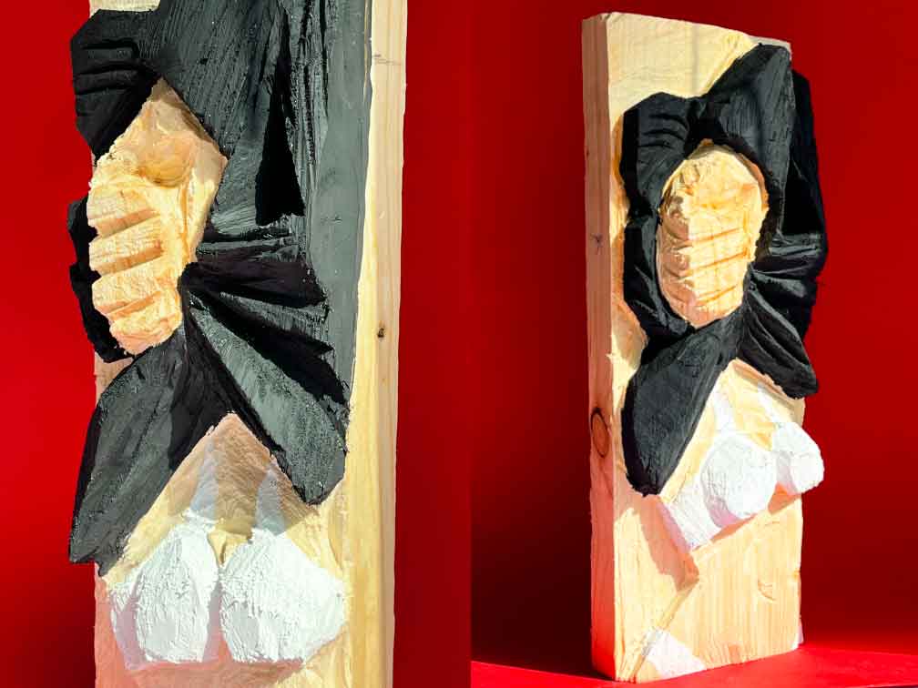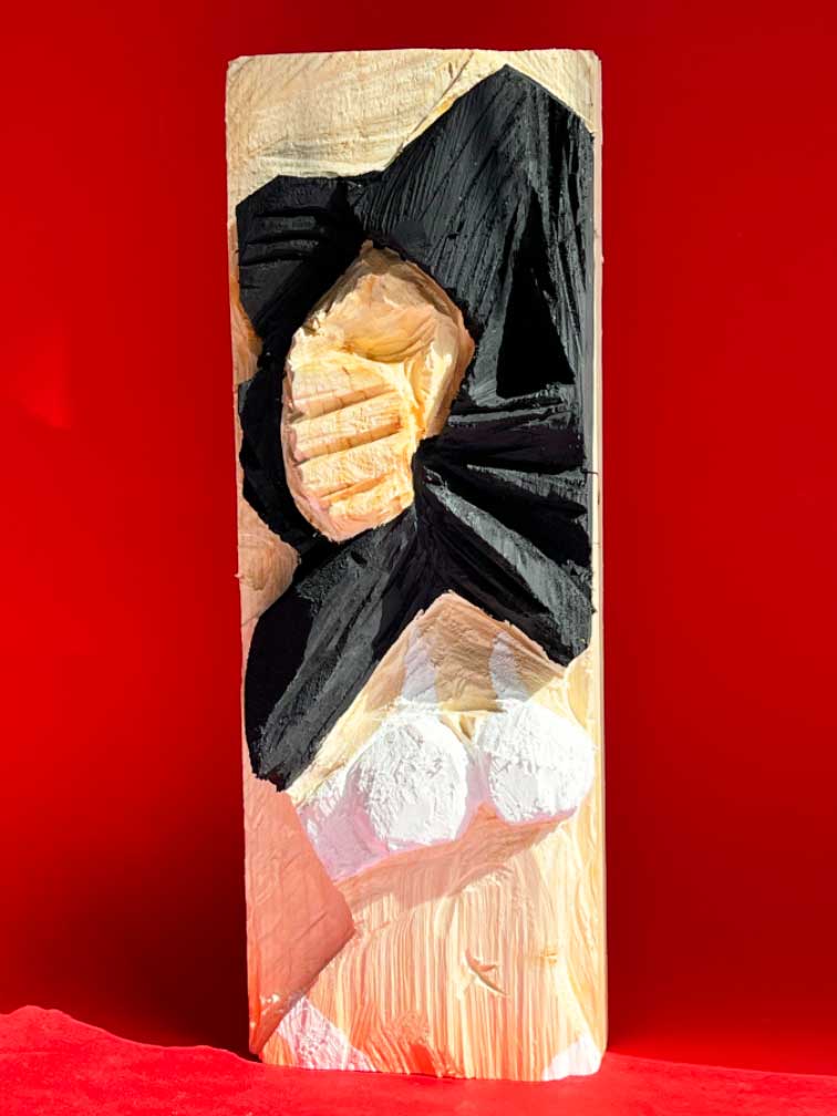 Die Entstehung von meinen Werken darf man spüren. Details sind Nebensache. Meine menschlichen Reliefs sind wie meine Skulpturen sinnlich und direkt. Aus rohen Fichtenstämmen lass ich Figuren entstehen, bei denen jede Arbeitsspur sichtbar bleibt und das Relief lebendig wirken lässt.